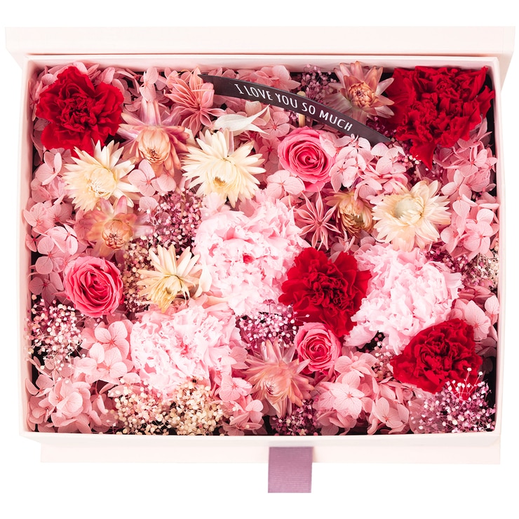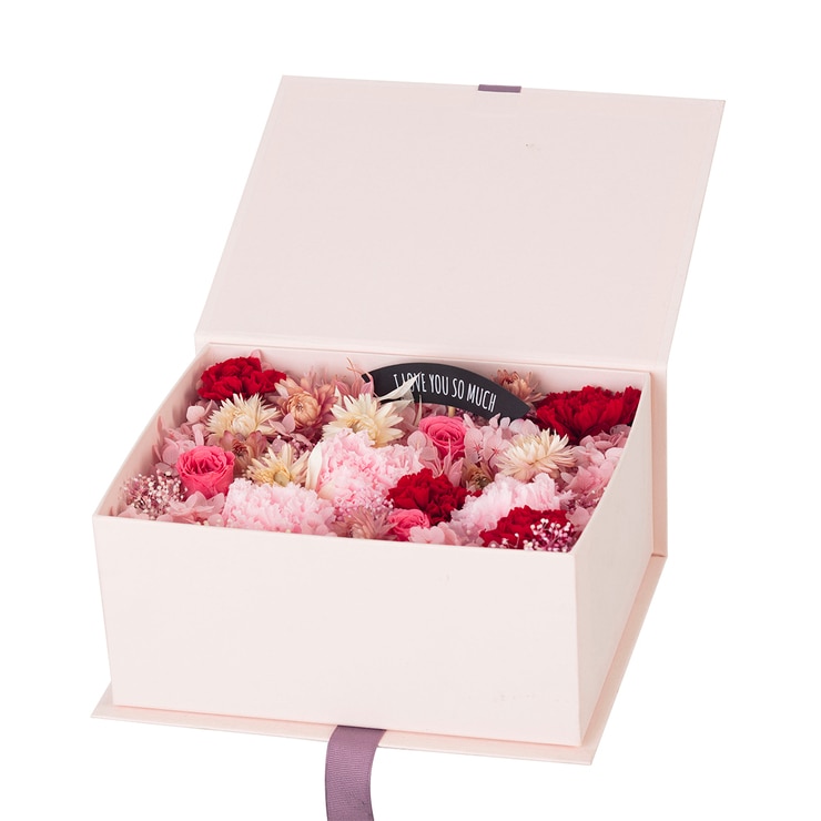 생화를 보존액 처리한 프리저브드 카네이션과 기타 소재들로 구성된 가정의달 플라워박스입니다. 어버이날, 스승의날 선물로 인기가 많습니다.